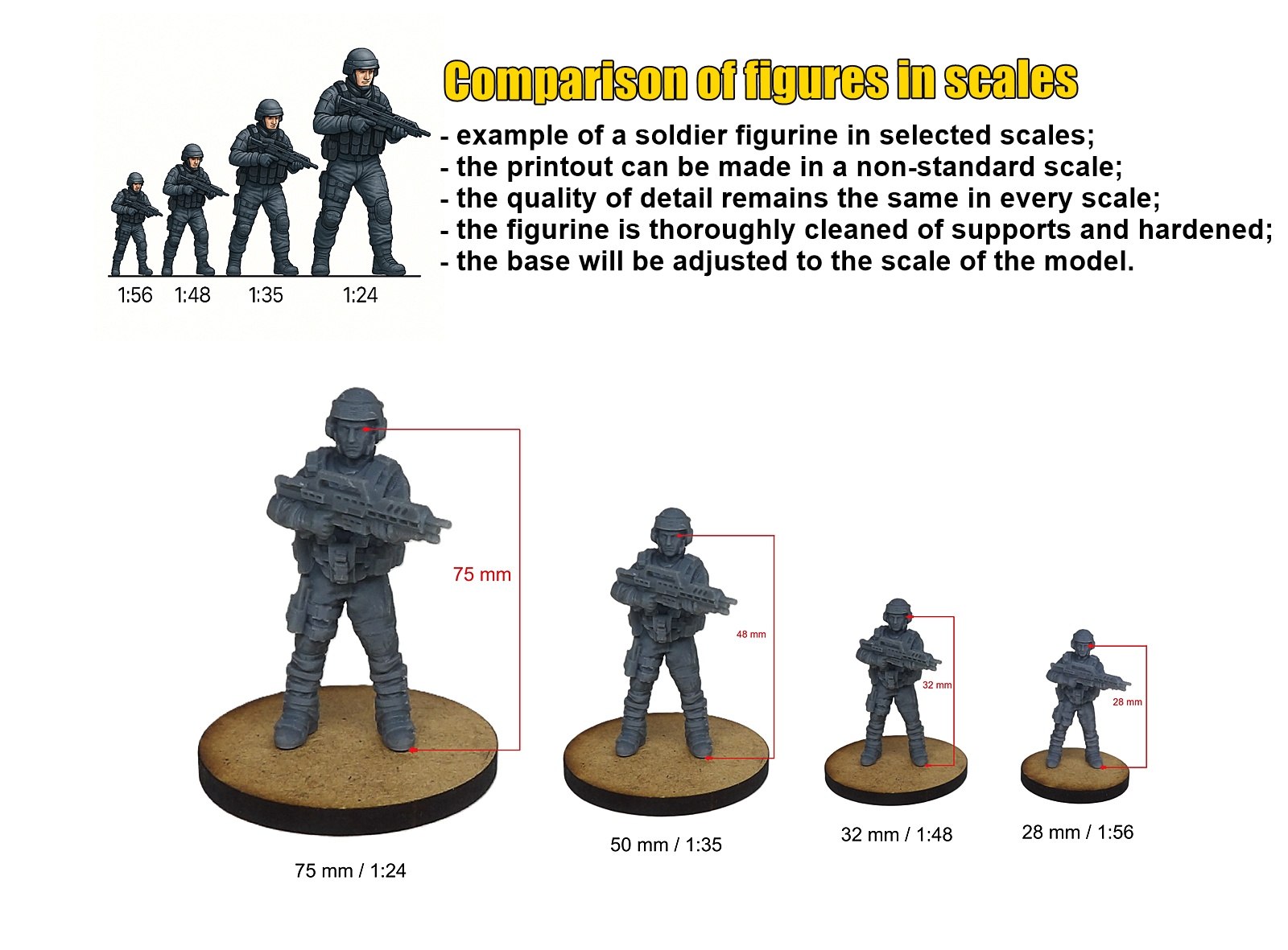 I offer four standard scales for all figurines and models available in the store: 1:56, 1:48, 1:35, 1:24.